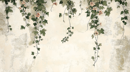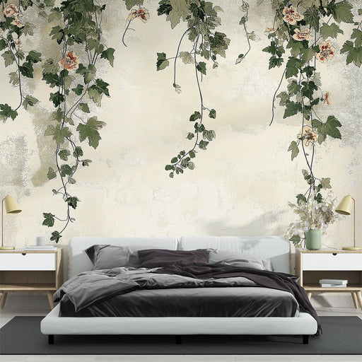 WonderMuralEntdecken Sie unsere elegante Shabby Chic Tapete, die ein prächtiges Muster von grünen Ranken mit zarten Blumen auf einem cremefarbenen Hintergrund...