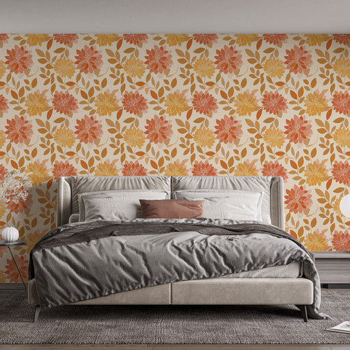 WonderMuralUnsere exklusive Tapete zeigt ein wunderschönes Blumenmuster in warmen Herbsttönen, das Blumen in Rot-, Orange- und Gelbtönen auf einem cremefarben...