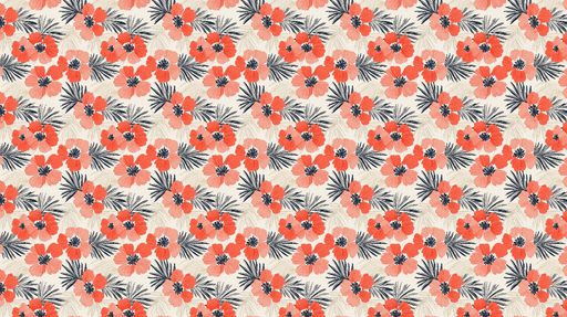 WonderMuralUnsere Tapete zeigt ein unvergessliches Motiv von Hibiskusblumen in lebendigen Rottönen und Korallen, umgeben von zart illustriertem tropischem Lau...