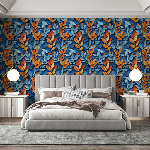 WonderMuralDiese Tapete zeichnet sich durch ihr lebhaftes Blätterdesign aus, das verschiedene Blautöne, Orange, Gelb und Schwarz mischt. Die organischen Forme...