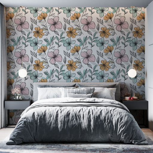 WonderMuralUnsere Tapete zeigt ein wunderschönes Blumenmuster, mit zart gezeichneten rosa, gelben und blauen Blumen, umgeben von feinem Laub. Die Pastellfarbe...