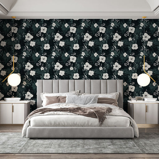 WonderMuralDiese Tapete zeigt ein wunderschönes Muster aus weißen Blumen und dunklem Laub, das eine elegante und beruhigende Atmosphäre schafft. Die tiefen Gr...
