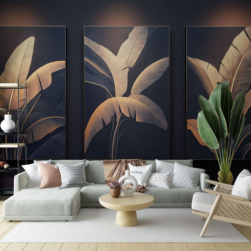 WonderMuralUnsere Tapete zeigt ein Muster von goldenen Blättern, die auf einem dunklen Hintergrund zart hervorgehoben sind und so einen auffälligen und raffin...