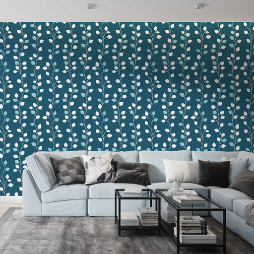 WonderMuralDiese Tapete zeigt ein elegantes Muster aus weißen und grünen Blättern, die auf einem dunkelblauen Hintergrund miteinander verflochten sind und so ...