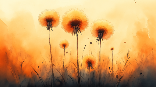 WonderMuralDiese Fototapete zeigt ein prächtiges Muster von orangefarbenen Blumen, die vom warmen Licht eines Sonnenuntergangs erleuchtet werden und eine einl...