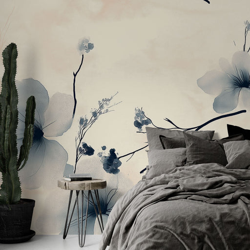 WonderMuralDiese Tapete bietet ein wunderschönes Aquarellblumenmuster, das weiche blaue und graue Blumen hervorhebt, die harmonisch auf einem cremefarbenen Pa...