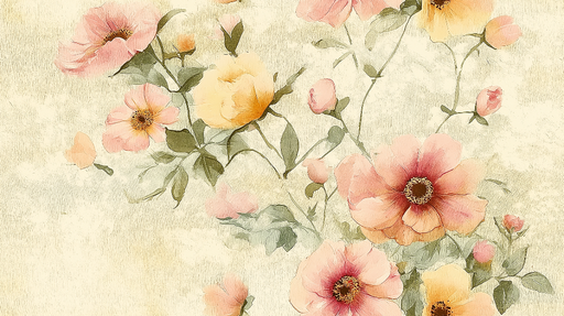 WonderMuralEntdecken Sie unsere florale Tapete, die ein wunderschönes Aquarell-Muster zeigt und zarte Blumen in sanften Rosatönen, Gelb und Pfirsich hervorheb...