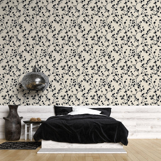 WonderMuralEntdecken Sie unsere naturinspirierte Tapete mit einem zarten Motiv von schwarzen Ästen und Aquarellblättern auf einem weichen cremefarbenen Hinter...