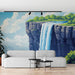 Diese Tapete zeigt einen majestätischen Wasserfall , der von einer Klippe stürzt, umgeben von üppigem Grün und einem strahlend blauen Himmel. Die Blautöne im Wasser und die Details der Felsen schaffen eine ruhige und erfrischende Atmosphäre, ideal, um einen Hauch von Natur in Ihr Interieur zu bringen.