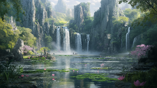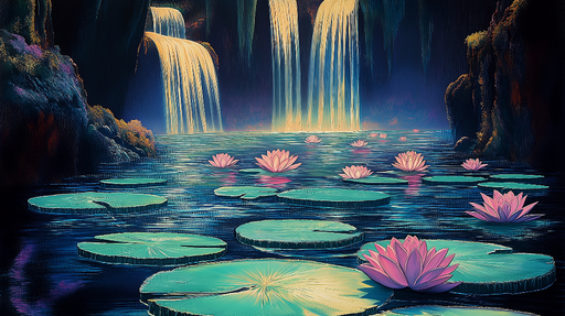 Art'lolo```html Entdecken Sie unsere Tapete Landschaft, die einen atemberaubenden Wasserfall umgeben von üppiger Vegetation und rosa Lotosblumen, die auf d...