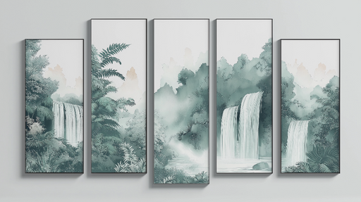WonderMuralUnsere originale Tapete zeigt eine majestätische Wasserfalllandschaft, gemalt in sanften Grüntönen und Aquarellblau. Die anmutigen Wasserfälle füge...