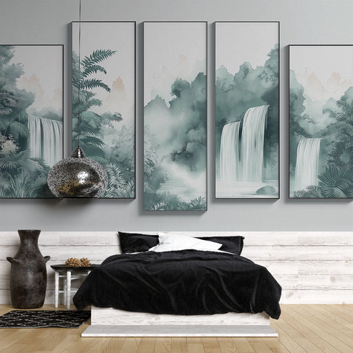 WonderMuralUnsere Fototapete zeigt eine prächtige Berglandschaft in fünf Teilen, die einen Wasserfall aus einem üppigen Tal darstellt. Die Grüntöne, die von d...