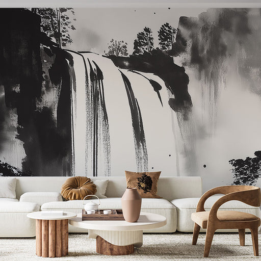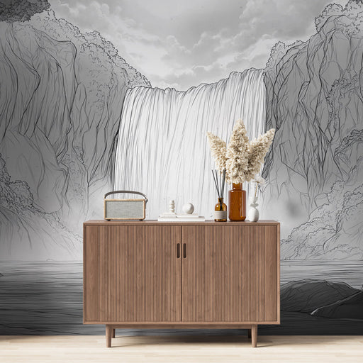 WonderMuralDiese Fototapete ruft einen majestätischen Wasserfall hervor, der in einem monochromen Stil geschaffen wurde und eine beeindruckende und beruhigend...