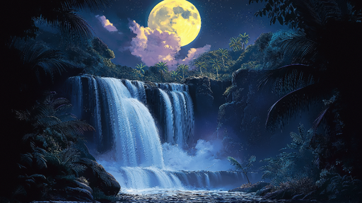 Vollständige Details anzeigenTapete nächtlicher Wasserfall | Eine friedliche Szene eines Wasserfalls unter dem Vollmond