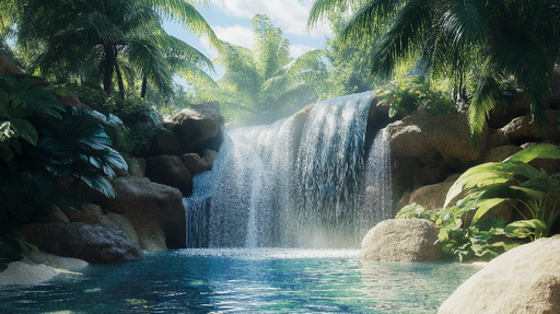 Vollständige Details anzeigenTapete tropischer Wasserfall | Eine beruhigende Szene üppiger Natur mit einem Wasserfall und Palmen