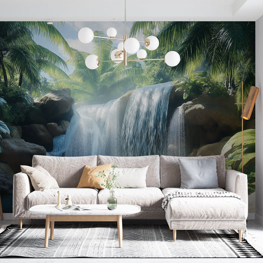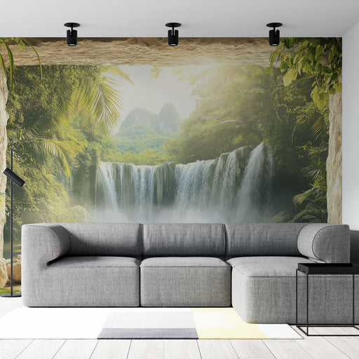 WonderMuralDiese Tapete bietet einen beeindruckenden Blick auf einen tropischen Wasserfall, der in natürliches Licht getaucht und von üppiger Vegetation umgeb...