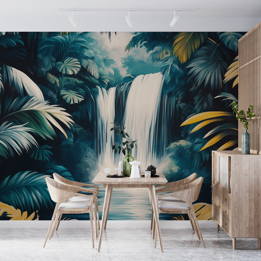 WonderMuralDiese faszinierende Tapete zeigt einen beeindruckenden Wasserfall, umgeben von felsigen Wänden und üppiger Vegetation, alles illustriert in einer m...