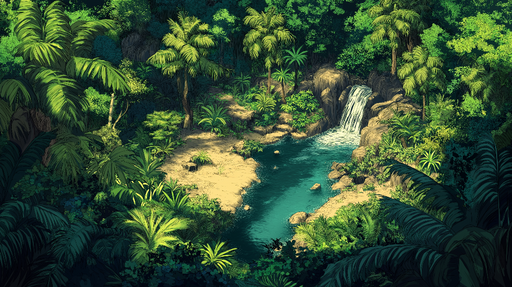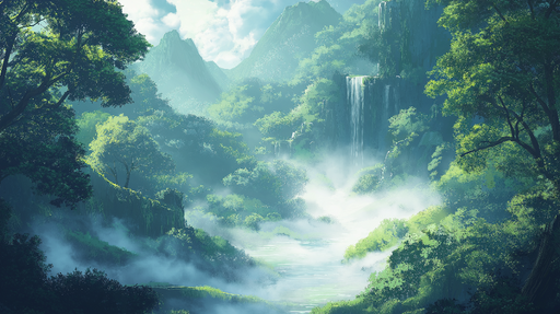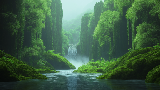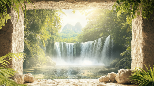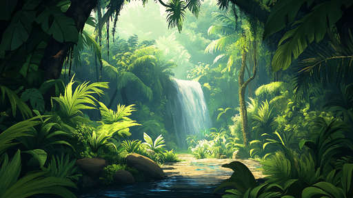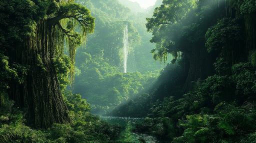 Vollständige Details anzeigenTapete tropischer Wald | Üppige Landschaft mit Wasserfall und sanftem Licht