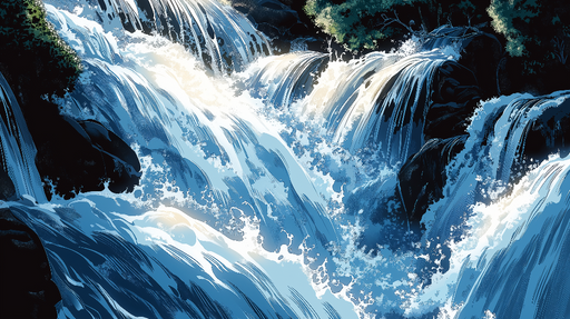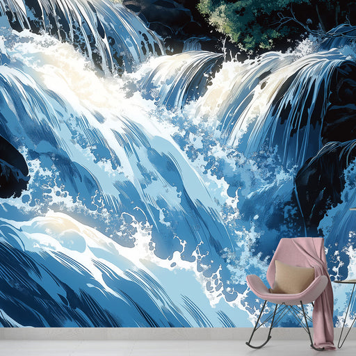 WonderMuralDiese Tapete zeigt eine wunderschöne Illustration von Wasserfällen, wo das Wasser elegant über Felsen fließt und eine beruhigende und belebende Atm...