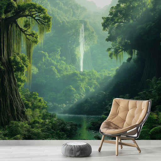 WonderMuralUnsere Wandtapete zeigt eine lebendige Dschungellandschaft, in der die Schönheit der Natur durch dichte Vegetation und einen sanften Wasserfall zum...