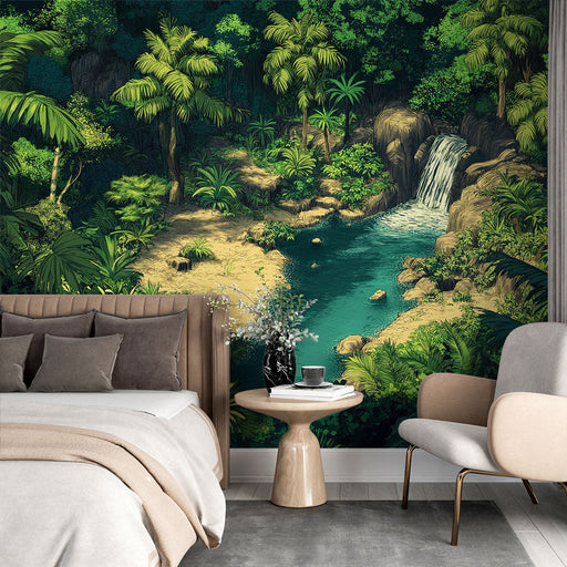 WonderMuralEntdecken Sie unsere faszinierende Tapete mit einem üppigen tropischen Wald, in dem ein sanfter Wasserfall in einen ruhigen Pool fließt, umgeben vo...