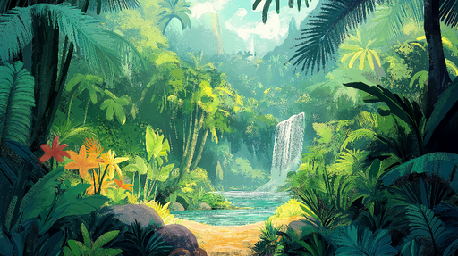 Vollständige Details anzeigenTapete dschungel | Üppige Landschaft mit Wasserfall und tropischen Blumen