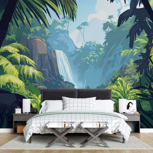 WonderMuralDiese Tapete erweckt ein tropisches Paradies zum Leben, das einen üppigen Dschungel mit reicher Vegetation und einem prächtigen Wasserfall illustri...