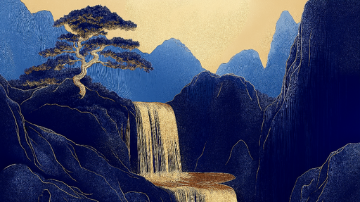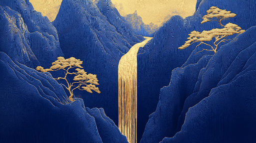 Vollständige Details anzeigenTapete bergig | Goldener Wasserfall auf tiefblauem Hintergrund