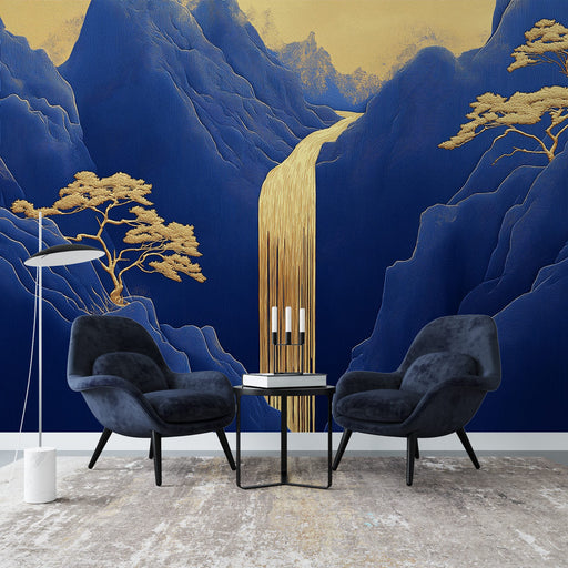 WonderMuralDiese faszinierende Tapete zeigt eine von der Natur inspirierte Landschaft, die goldene Wasserfälle zeigt, die über Mitternachtsblau Felsen fließen...