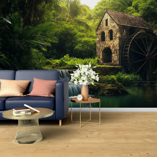 WonderMuralDiese bezaubernde Tapete zeigt eine malerische Wassermühle, eingebettet im Herzen eines üppigen Dschungels, die eine friedliche und ruhige Atmosphä...