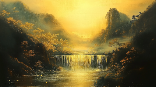 Vollständige Details anzeigenTapete Berglandschaft | Goldener Wasserfall in einem nebligen Tal