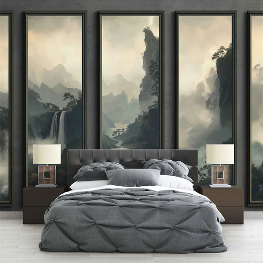 WonderMuralUnsere Tapete zeigt eine atemberaubende asiatische Landschaft, die majestätische Berge, die in weiche Wolken gehüllt sind, und funkelnde Wasserfäll...