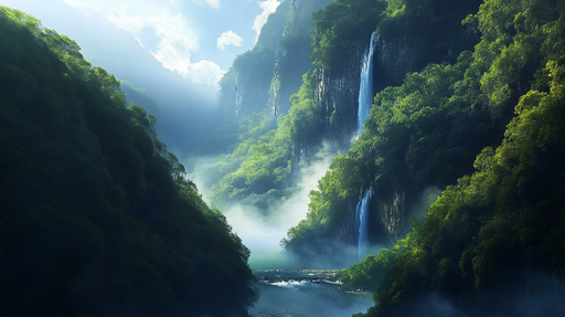 Vollständige Details anzeigenTapete üppige Landschaft | Üppiges Tal mit beruhigendem Wasserfall