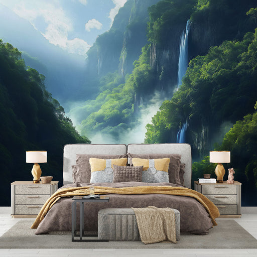 WonderMuralUnsere Tapete zeigt eine üppige Naturszene mit Wasserfällen, die durch üppige Wälder stürzen. Die Grüntöne und die sanften Pastelltöne des Himmels ...