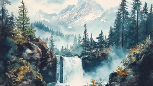 Vollständige Details anzeigenTapete natürliche Landschaften | Wasserfälle und umliegende Berge in Aquarell