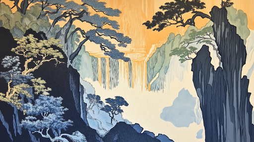 Vollständige Details anzeigenTapete natürliche Landschaft | Stilisierte Wasserfälle mit einem majestätischen Baum