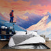 Diese Tapete bietet eine spektakuläre Berglandschaft, in der ein Snowboarder die majestätischen Gipfel im goldenen Sonnenuntergangslicht bewundert. Die Schattierungen von Rosa, Orange und Blau verschmelzen harmonisch und schaffen eine Atmosphäre, die sowohl dynamisch als auch beruhigend ist.