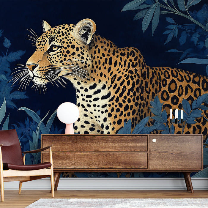 Entdecken Sie unsere herrliche Tapete mit einem majestätischen Leoparden, der sorgfältig in eine üppige Laubkulisse integriert ist. Mit seiner Farbpalette von Gold bis Tiefblau fällt dieses Design sofort ins Auge und verleiht Ihrem Raum einen Hauch von Exotik.
