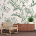 Diese schäbige schicke Tapete zeigt ein elegantes Blumenmuster in weichem Grün auf rein weißem Hintergrund. Die Blumen sind mit bemerkenswerter Feinheit gezeichnet und schaffen eine beruhigende und romantische Atmosphäre. Die zarten Blätter und Blumen verschmelzen harmonisch und bringen einen Hauch von Frische in Ihre Inneneinrichtung.