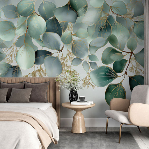 WonderMuralΑυτό το ταπετσαρία διαθέτει ένα όμορφο μοτίβο από λεπτά φύλλα σε αποχρώσεις του πράσινου και του γαλάζιου, με έμφαση σε αποχρώσεις του χρυσού. Η συ...