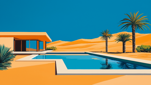 Προβολή πλήρων λεπτομερειώνTapete ερημικό μοντέρνο | Στιλιζαρισμένη βίλα δίπλα από την πισίνα σε έρημο περιβάλλον