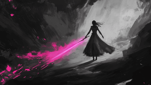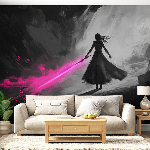 WonderMuralΑυτό το ταπετσαρία διαθέτει ένα ενδιαφέρον σιλουέτο μιας γυναίκας που φορά ένα ρούχο σε κίνηση, κρατώντας ένα ξίφος που εκπέμπει έντονο ροζ φως. Η ...