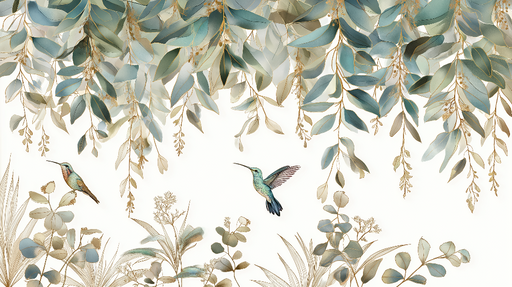 WonderMuralΤο όμορφο Tapete μας δείχνει ένα υπέροχο μοτίβο από κολιμπρί ζωηρά ανάμεσα σε λεπτά φύλλα σε καταπραϋντικές αποχρώσεις του πράσινου και του μπλε. Τ...