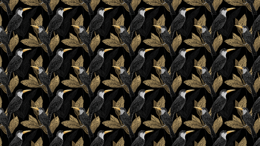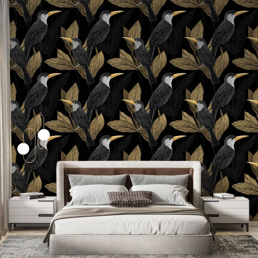 WonderMuralΑυτό το μοναδικό ταπετσαρία τοίχου διαθέτει ένα γοητευτικό μοτίβο από κομψά πουλιά που κάθονται σε χρυσά φύλλα, όλα σε ένα βαθύ μαύρο φόντο που ανα...