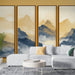 Αυτή η ταπετσαρία τοιχογραφίας προκαλεί τοπία από ομιχλώδη βουνά σε μια παλέτα χρυσών και μπλε αποχρώσεων, δημιουργώντας μια ήρεμη και μαγευτική ατμόσφαιρα. Οι μεγαλοπρεπείς κορυφές συγχωνεύονται διακριτικά με λεπτά σύννεφα, προσφέροντας μια αισθητική που εμπνέει ειρήνη και ηρεμία σε οποιοδήποτε δωμάτιο.