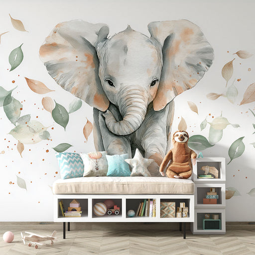 WonderMuralΑυτό το τοιχογραφία με ένα λεπτομερώς εικονογραφημένο ελέφαντα σε υδατογραφία, περιτριγυρισμένο από φύλλα σε απαλές αποχρώσεις του πράσινου και του...