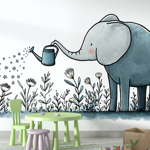 WonderMuralΑυτό το γοητευτικό ταπετσαρία τοίχου διαθέτει ένα γλυκό ελέφαντα που ποτίζει όμορφα λουλούδια σε απαλές αποχρώσεις του μπλε και του λευκού. Η εικόν...