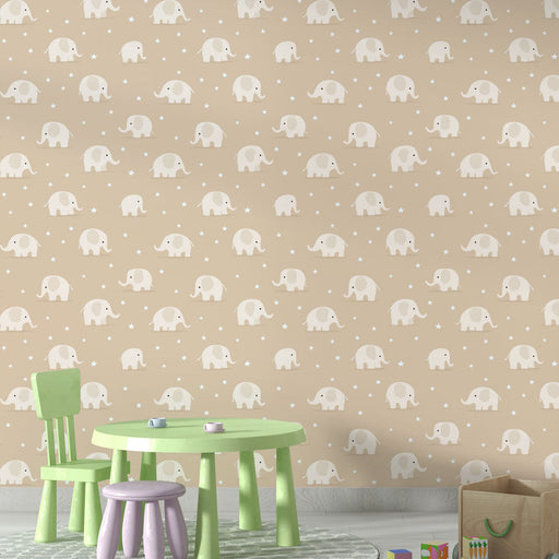 WonderMuralΤο όμορφο ταπετσαρία τοίχου διαθέτει ένα γοητευτικό μοτίβο με ελέφαντες σε μια μαλακή μπεζ φόντο, συνοδευόμενο από μικρά λαμπερά αστέρια. Κάθε προσ...
