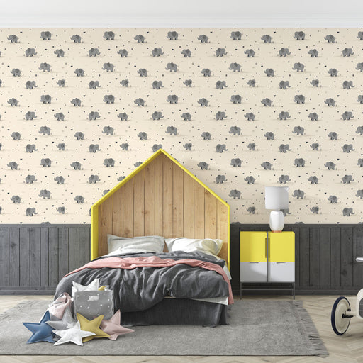 WonderMuralΑυτό το αξιαγάπητο ταπετσαρία τοίχου διαθέτει ένα επαναλαμβανόμενο μοτίβο από στιλιζαρισμένα ελέφαντες σε μια μαλακή μπεζ φόντο, φέρνοντας μια ζεστ...