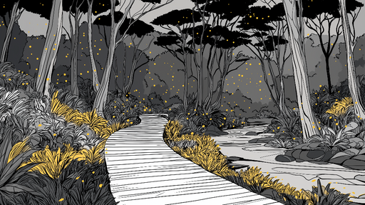 Προβολή πλήρων λεπτομερειώνTapete με μαγικό δάσος | Στροφογυριστό μονοπάτι που φωτίζεται από σφίγγες σε μαύρο και χρυσό λουλουδένιο σκηνικό